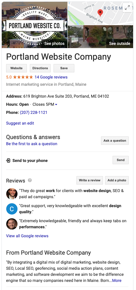 Direct Searches: When someone performs a direct search and only one listing pops up in the Knowledge graph on the right. For example, Portland Website Company in Portland ME or (since this is only a one-location business) Portland Website Company.